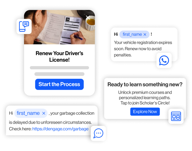 From benefit renewals to licensing reminders, public health notifications, and program onboarding, D·engage automates communication across native email, SMS, WhatsApp, push, onsite, and in app channels.