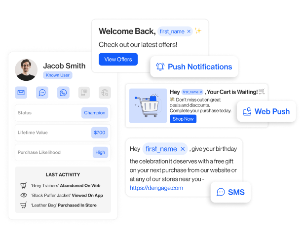 D·engage helps brands predict risk early, understand behavior clearly, and re engage customers across email, SMS, WhatsApp, push, in app, and onsite with perfect timing.